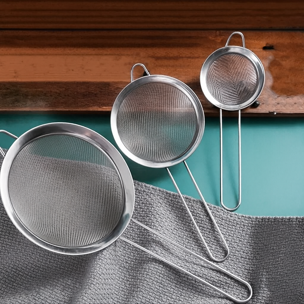 Tenha mais praticidade e eficiência na sua cozinha com o Conjunto de Peneiras em Aço Inox – 3 Peças.